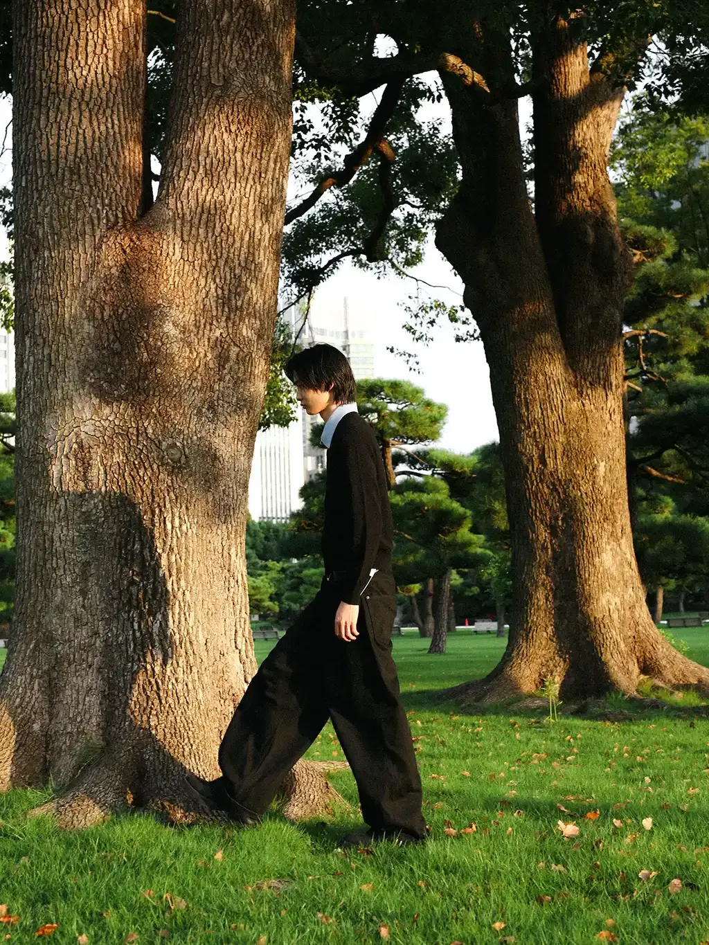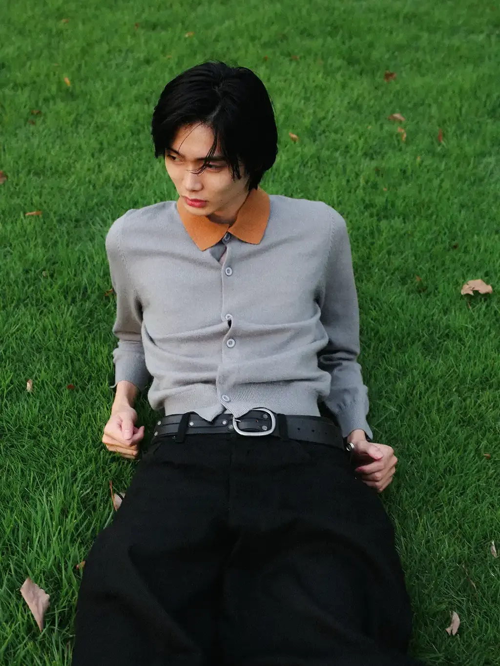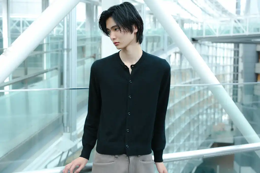 A round-neck knit cardigan with a detachable collar, designed to shift between two identities. Crafted in Japan from a balanced blend of nylon, wool, and acrylic — combining structure, warmth, and ease.