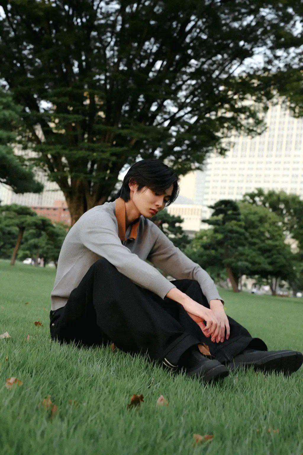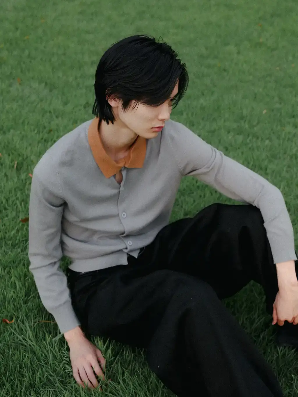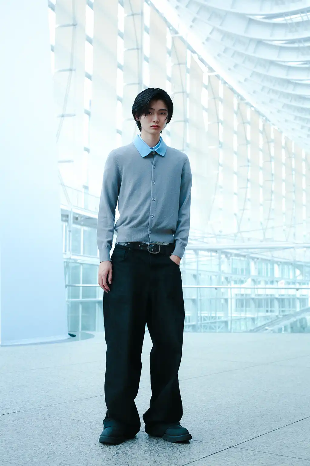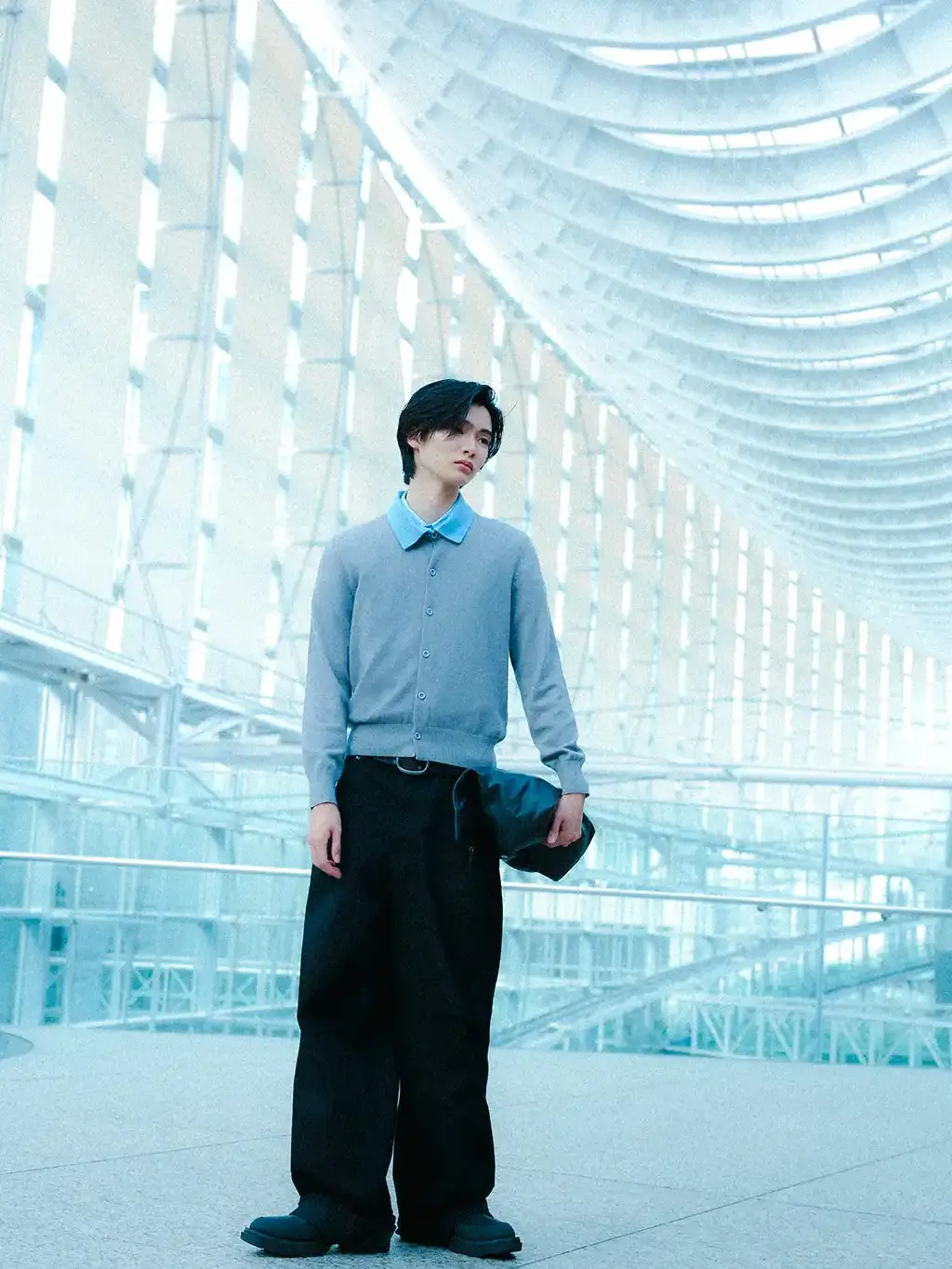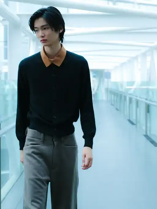 A round-neck knit cardigan with a detachable collar, designed to shift between two identities. Crafted in Japan from a balanced blend of nylon, wool, and acrylic — combining structure, warmth, and ease.