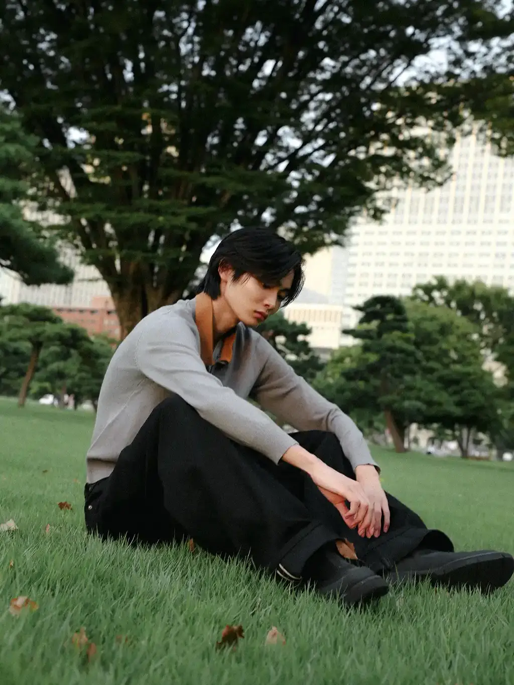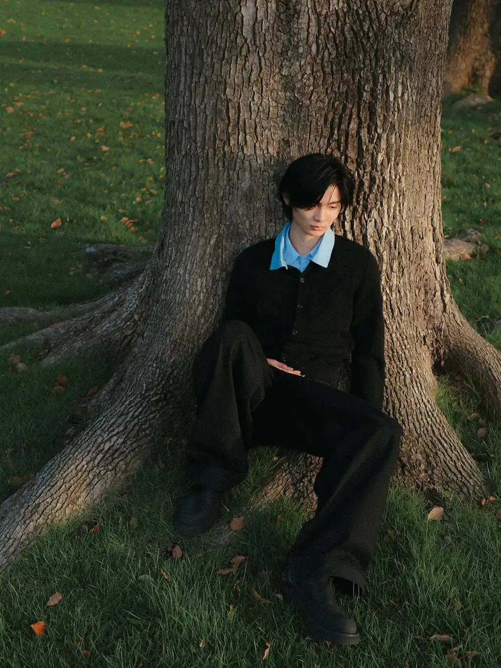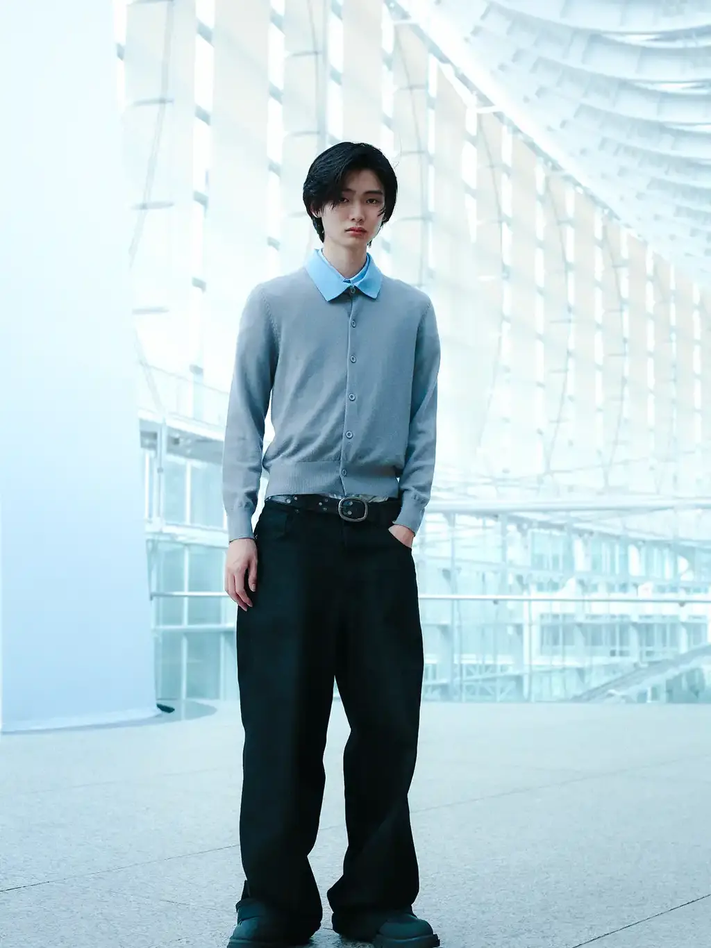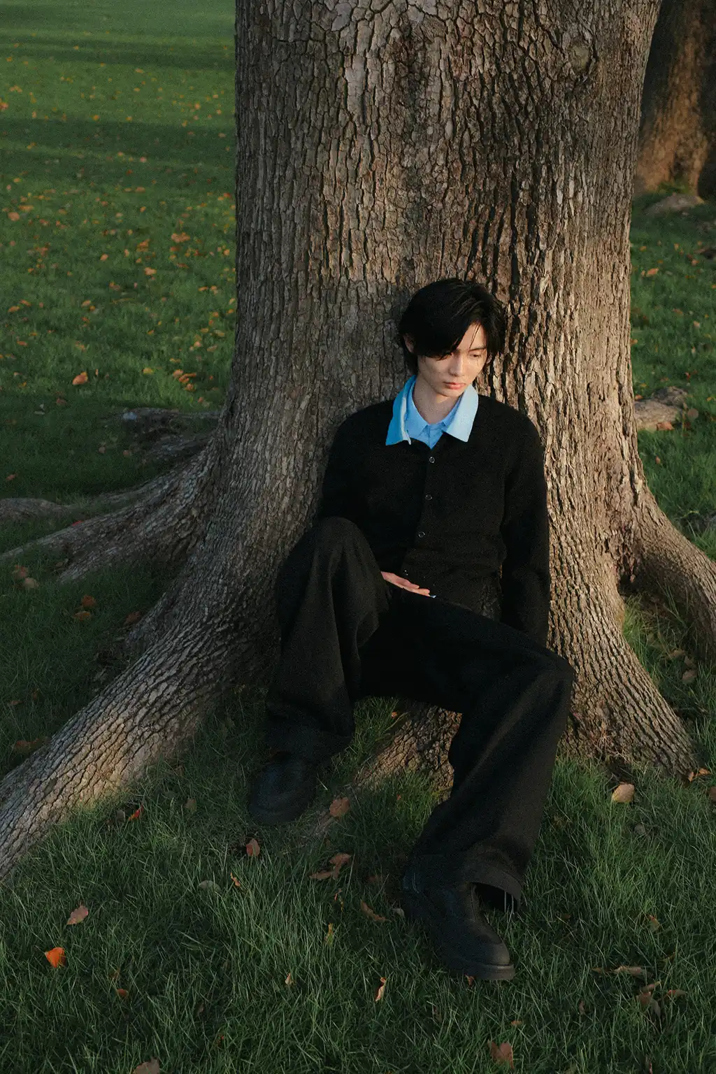 A round-neck knit cardigan with a detachable collar, designed to shift between two identities. Crafted in Japan from a balanced blend of nylon, wool, and acrylic — combining structure, warmth, and ease.